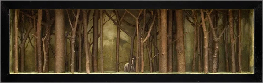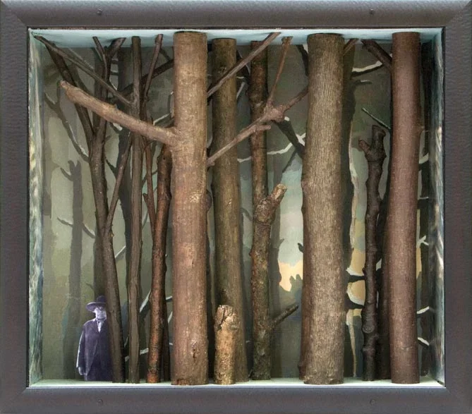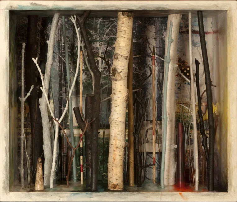 Southbury Trees is an ongoing series of paintings, watercolors, and mixed media boxes. The erect tree-trunk shapes create a horizontal rhythm across the composition, whether in two or three dimensions.
